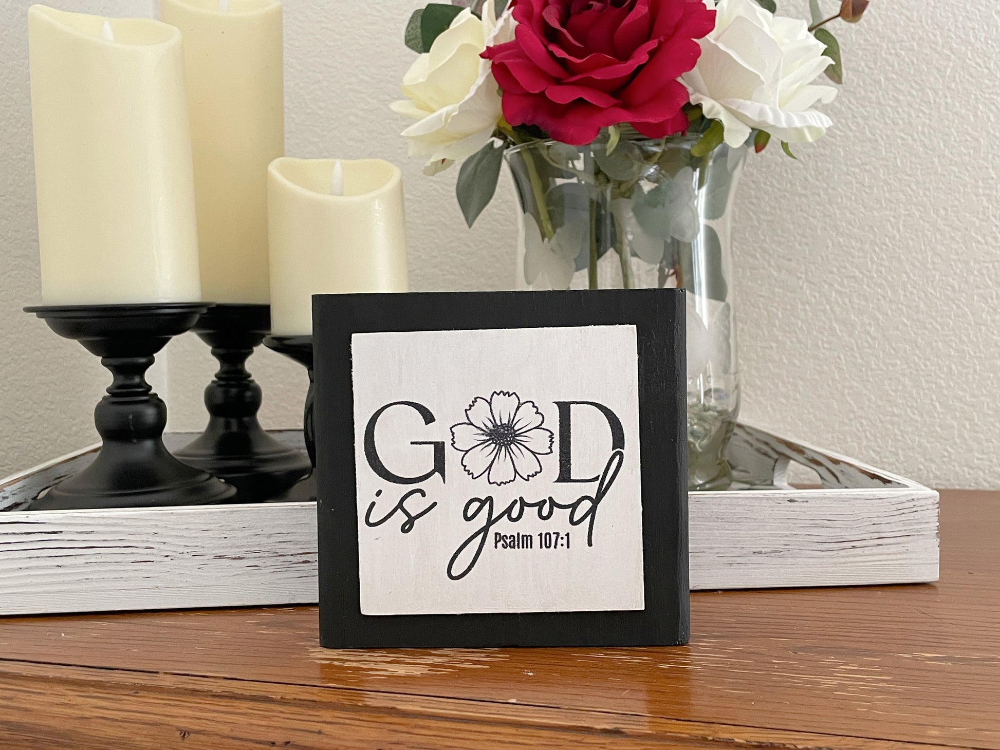 Designed to stand on any tier tray, shelf, or mantel, this inspiring wood art features the scripture from Psalm 107:1, "God is Good".