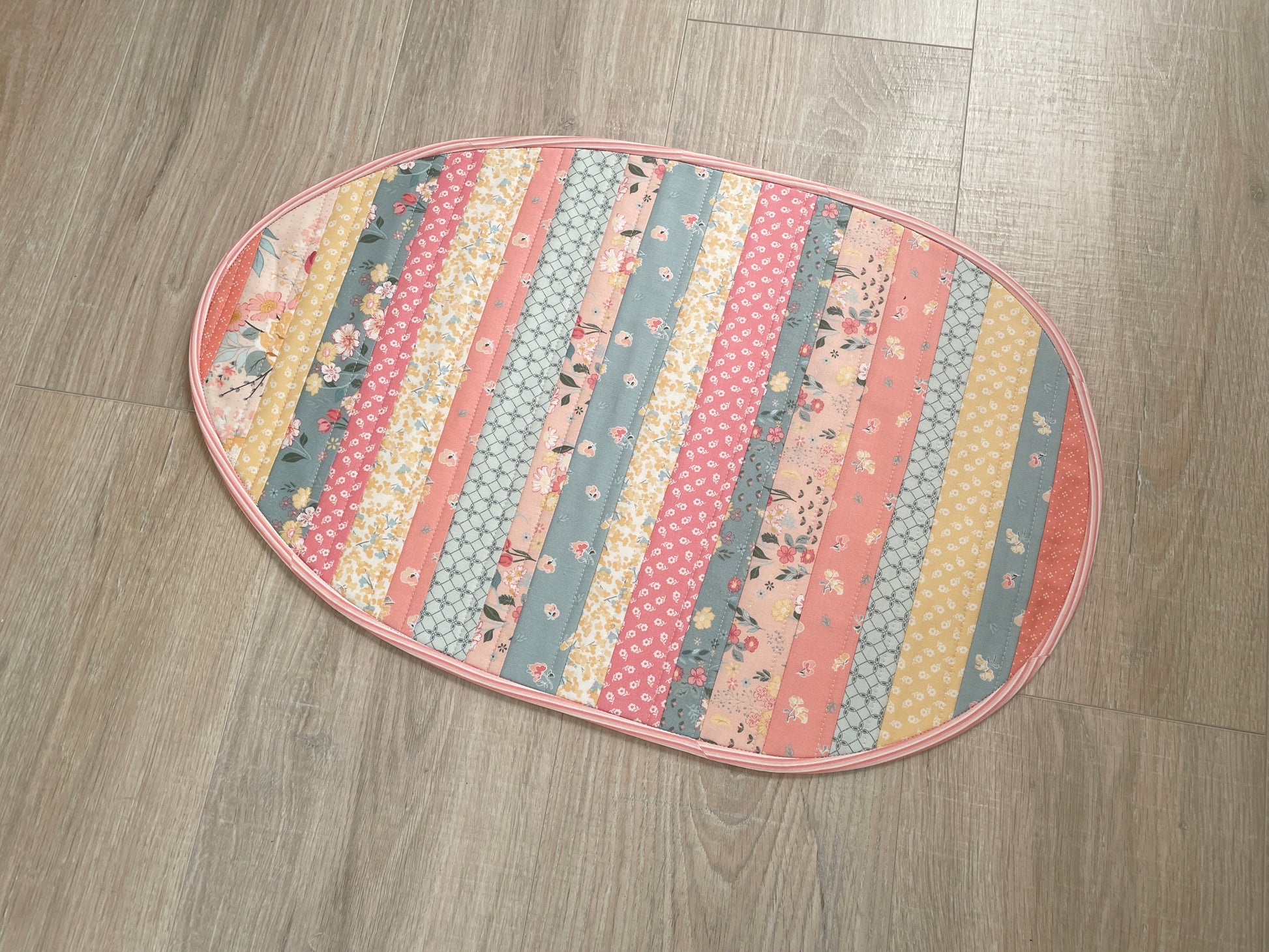 The layout of the fabric strips forms an Easter egg! The bright colors are so cheerful!