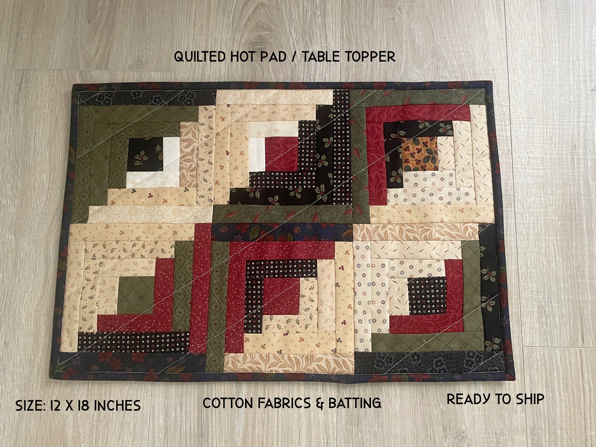 Log Cabin Table Topper, 12 x 18 Handmade Quilted Casserole Mat, Country Fall/Winter Decor