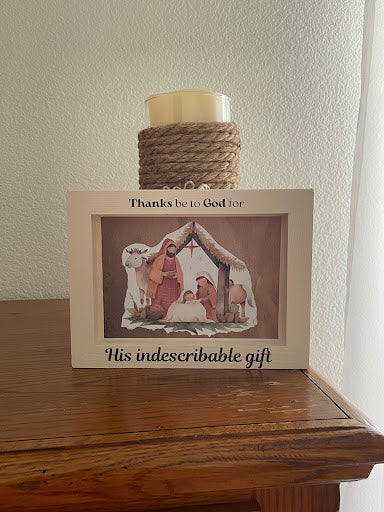 The shadow box is painted on all sides and slightly distressed with sandpaper. Scrapbook paper, a nativity manger scene, and lettering were decoupaged onto the shadow box.